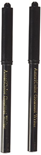 Americolor food decorating pens, set of two in black, can write on any food surface firm enough to write upon such as royal icing, marzipan, donuts, bagels, gum paste, milk Jell-O, crackers, cookies, ganache, pastries, rolled fondant, petit fours, bread, pastillage, fruit, vegetables, rice paper, hard boiled eggs and white chocolate. Perfect for stenciling, stamping or freehand, it's the perfect creative tool that will stimulate your imagination. Versatile, artistic nib draws fine detail, medium or broad lines, depending on the angle in which the pen is held.Wipe Tip on clean paper towel during use if needed. U.S. Certified food coloring. Store in refrigerator to prolong use.